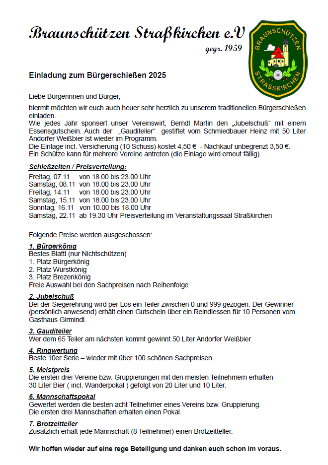 Beim Herbstdultschiasn 2025 auf der Passauer Herbsdult konnten wir 5 besondere Preise einfahren. Meistpreis: 24 Teilnehmer (+5 2ter) LP Landkreispokal Gewinner Mannschaft Gaukönigin Nadine Unertl Gauvizekönigin Lea Küblböck Gaumeister LP Florian Himmelsbach Gauvizekönigin Lea Küblböck & Gaukönigin Nadine Unertl Gaumeister LP Florian Himmelsbach & MdB Hans Koller